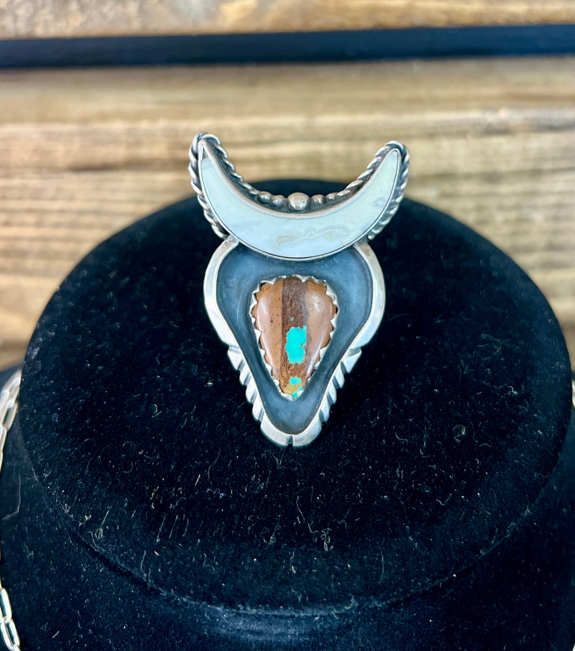 Take your accessory game to the wild west with this sterling bull skull ring featuring Royston turquoise and Snow White agate. Perfect for adding a touch of quirky style to any outfit. Yee-haw!