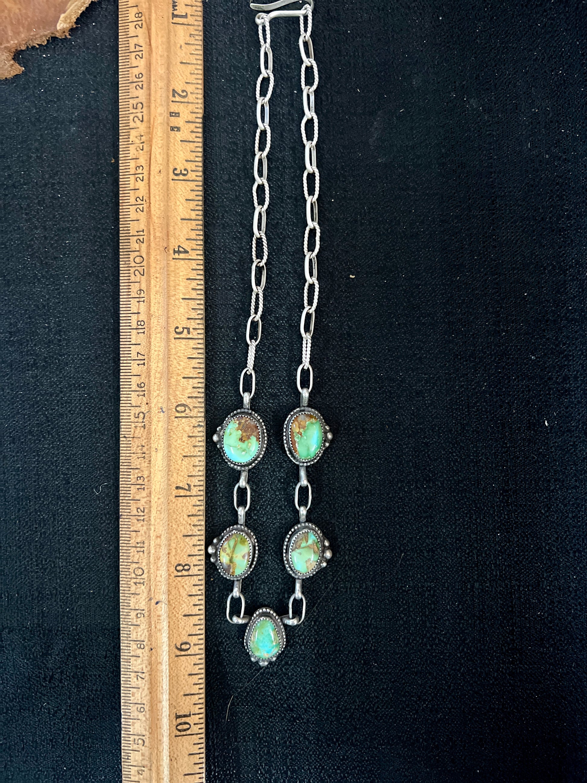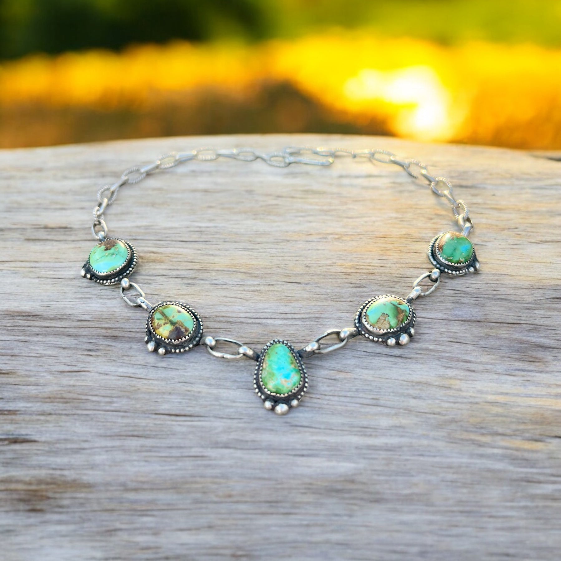 This Choker has beautiful green and blue Sonora Mt. Turquoise. Set in sterling and fine sliver. From the settings to the chain this piece is 100% handcrafted.